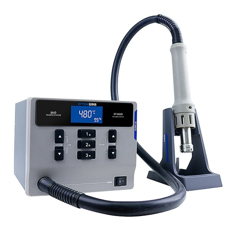 The Atten ST-862D hot air soldering station is a unit with 1000 watts of power, whereby the station reaches operating temperature very quickly. The temperature can be set manually between 100 and 480°C or set to one of three user-defined temperatures at the push of a button. The device has an adjustable volume flow (max. 120 L / min). With the silicone buttons, temperature & volume flow as well as a variety of built-in functions such as an auto-sleep function can be regulated. In addition, the system has an overheating protection system and a good cooling system that allows very long operation.