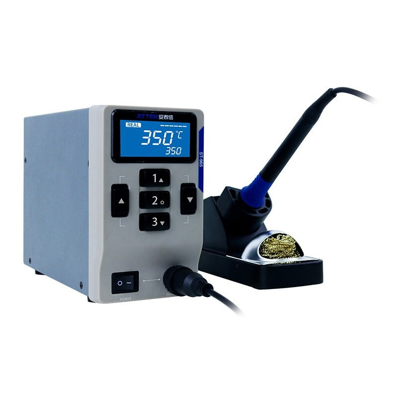 The Atten ST-965 soldering station has a high-quality heating element with 65 watts of power. The ST-965 is equipped with a user-friendly display. The soldering station automatically lowers the temperature to 200°C when not in use. This enables a longer service life of the soldering tip. Three different soldering temperatures can easily be programmed individually and can be called up directly by pressing the appropriate selection key.
