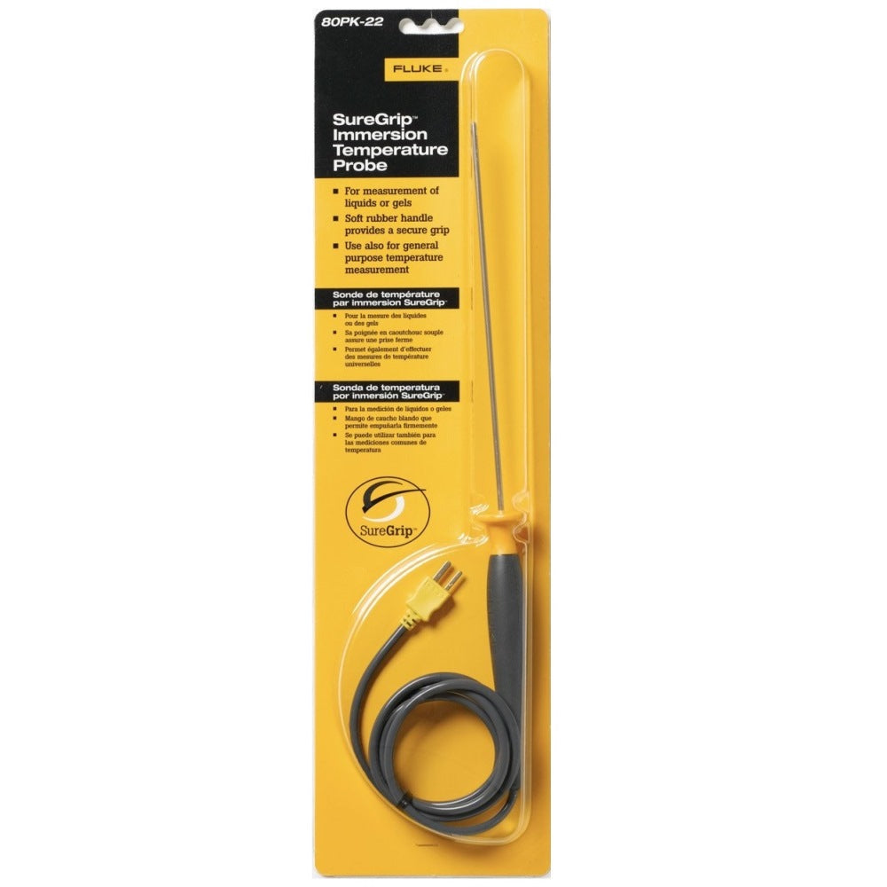 Fluke 80PK-22 SureGrip Immersion Temperature Probe is designed for use in liquid and gels. It can also be used as a general purpose temperature probe. The thermocouple junction is protected from tip to handle by an Inconel sheath. The 80PK-22 can be used with any temperature-measuring instrument that is designed to accept type K thermocouples and has a miniature connector input.