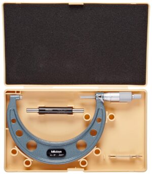 The Mitutoyo 103-181 Outside Mechanical Micrometer features a hammertone, green, baked-enamel finished frame and Carbide tipped measuring faces. This model includes a Ratchet Stop, Standard Bar and a Measuring Range of 4 to 5″ with an Accuracy of +/- 0.00015″.